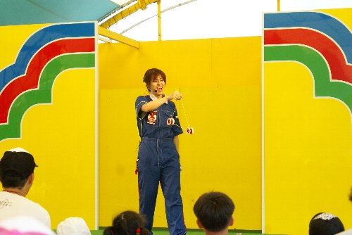 さて、2回あるパフォーマンスのうち1回目は着いたときには始まってていつものTrick!Trick!Trick !の終盤でした。今回8月の11日からアメリカで行われるヨーヨー世界大会に出場されるとあって、予行演習もかねて、世界大会用FSも披露してくれました。その様子は大会前ということなので秘密とさせていただきます。